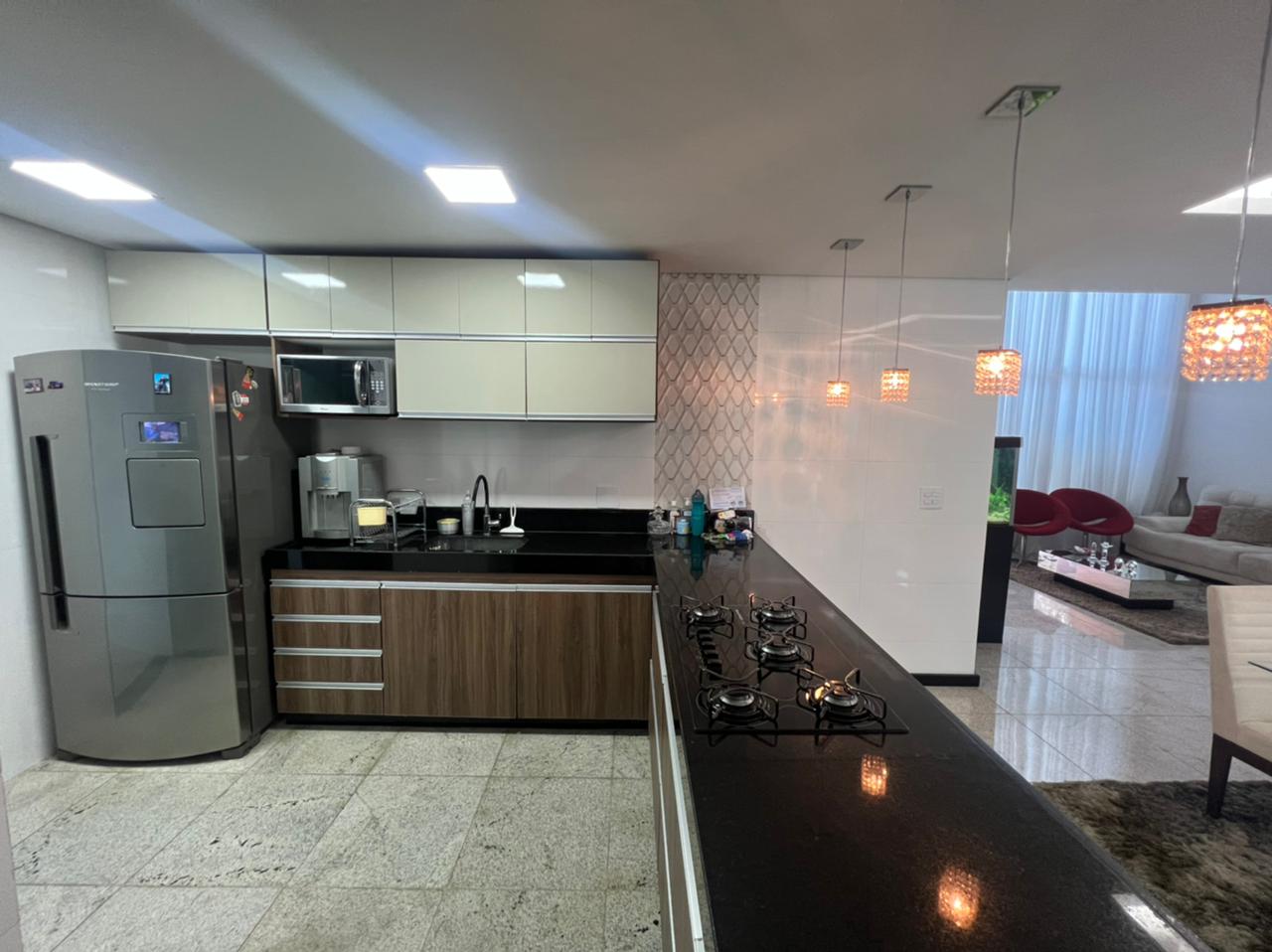 🔹Cozinha Americana com bancadas em ilha em granito preto, todo com armários planejados, despensa.